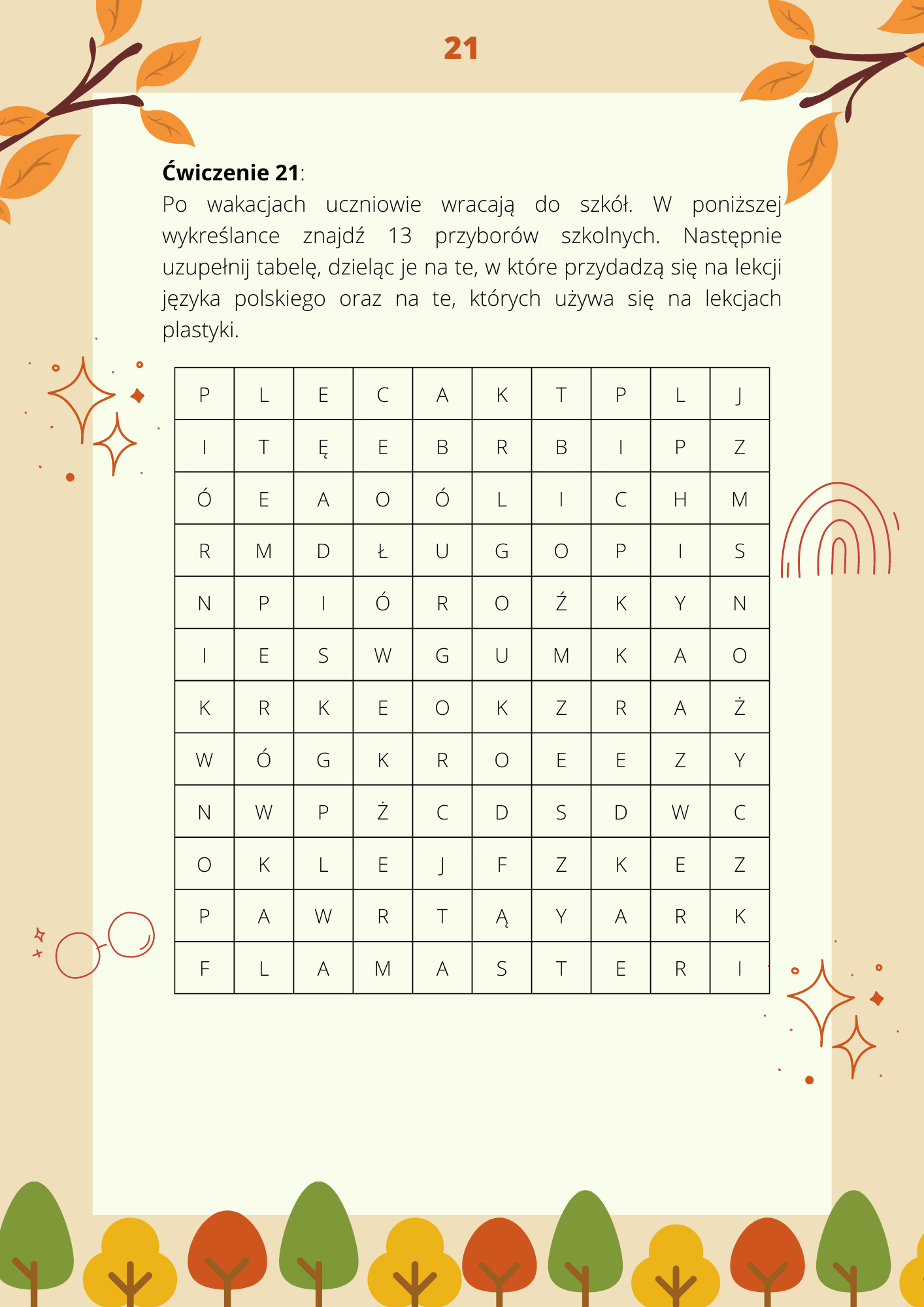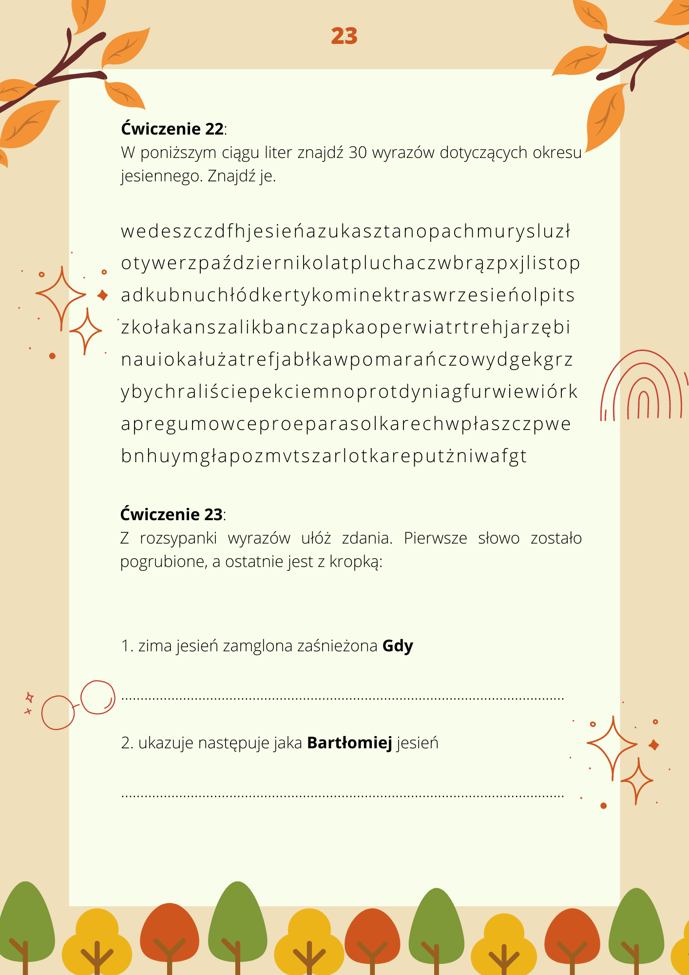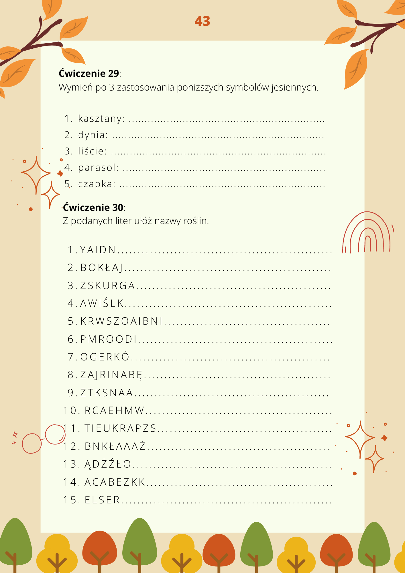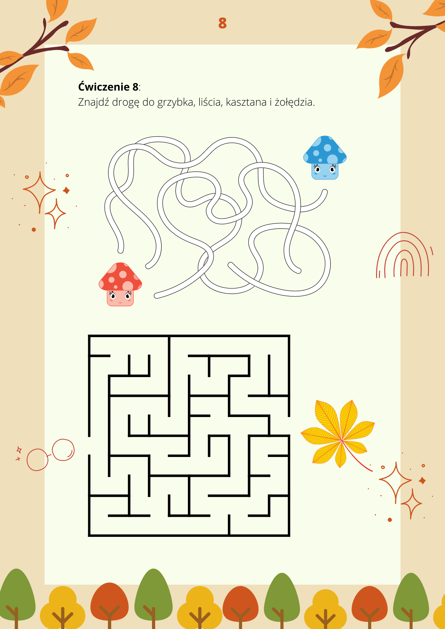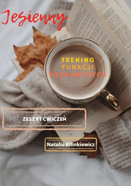 „Jesienny Trening Funkcji Poznawczych” to zeszyt ćwiczeń pełen jesiennej aury. Tematyka ćwiczeń pozwala zanurzyć się w ten wyjątkowy czas – pełen ciepłych barw, leśnych zapachów i korzennego smaku.