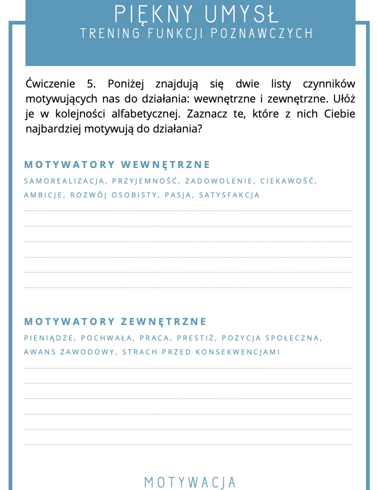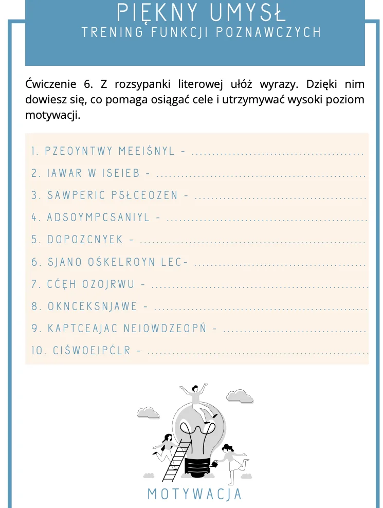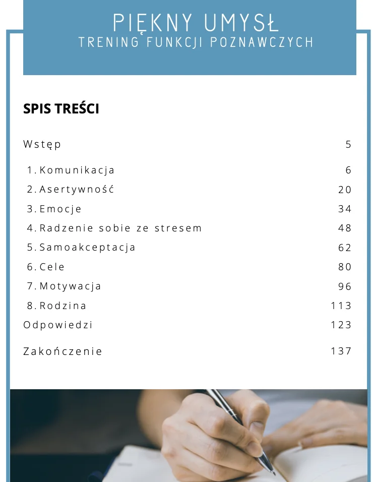 Piękny Umysł” to zeszyt ćwiczeń treningu funkcji poznawczych. Dedykowany jest osobom zainteresowanym własnym rozwojem, jak i potrzebującym wsparcia w zakresie zdrowia psychicznego. Jest to również narzędzie dla specjalistów: psychologów, terapeutów i pedagogów, pracujących – indywidualnie i w grupach – w szpitalach, klinikach, poradniach, domach opieki lub warsztatach terapii zajęciowej. Zawarte w zeszycie ćwiczeń zadania dają możliwość zastanowienia się nad własnymi kompetencjami społecznymi zarówno podczas pracy indywidualnej, jak i treningu funkcji poznawczych. Mogą być też uzupełnieniem warsztatów kompetencji miękkich, psychogimnastyki lub psychoedukacji.