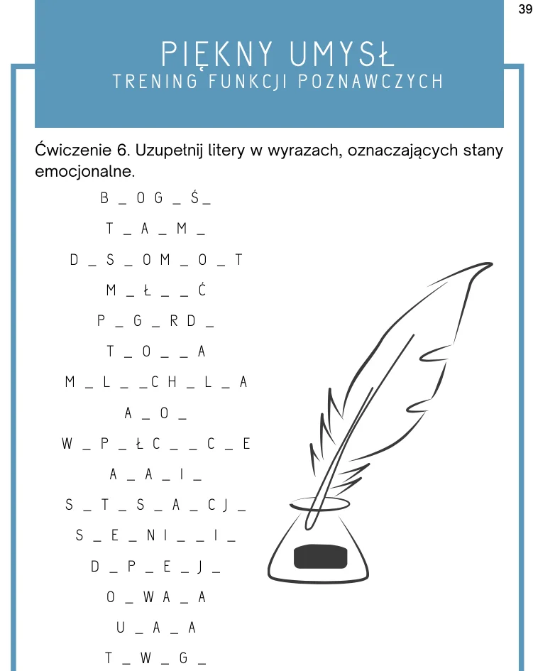 Ćwiczenia zawarte w e-booku wspomagają sprawność umysłową oraz rozwój procesów poznawczych. Zatrzymują ich deteriorację, redukują stres i edukują. Różnorodność zadań wzmacnia m.in.: koncentrację, uwagę, pamięć, funkcje językowe, myślenie logiczne, funkcje wzrokowo-przestrzenne.