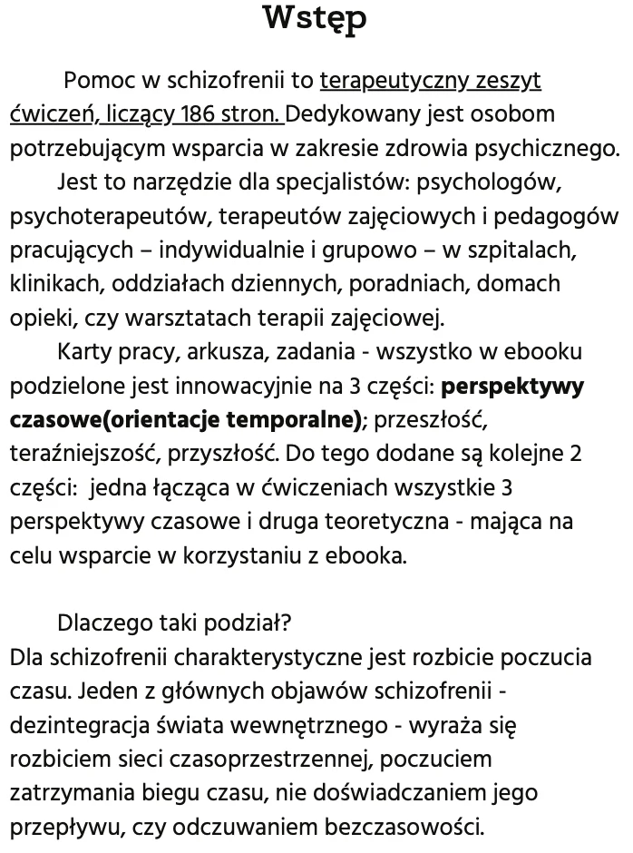 Karty pracy, arkusze, zadania – wszystko w ebooku podzielone jest innowacyjnie na 3 części: perspektywy czasowe (orientacje temporalne), przeszłość, teraźniejszość, przyszłość. Do tego dodane są kolejne 2 części: jedna łącząca w ćwiczeniach wszystkie 3 perspektywy czasowe i druga teoretyczna, mająca na celu wsparcie w korzystaniu z ebooka.