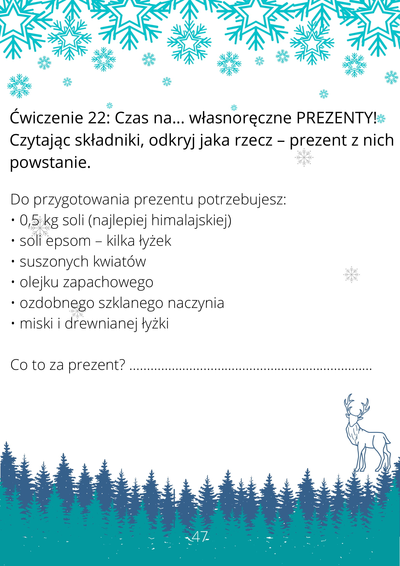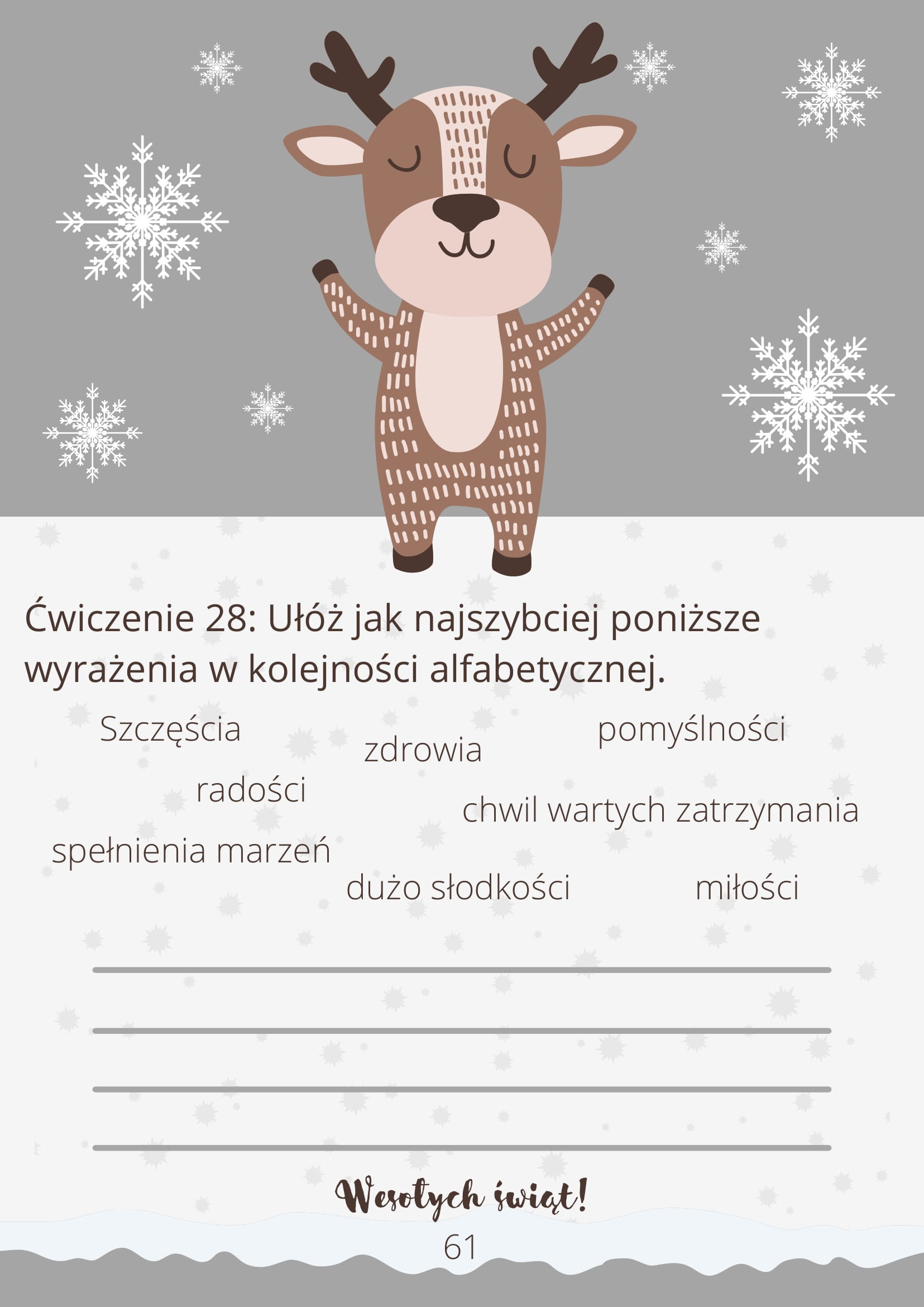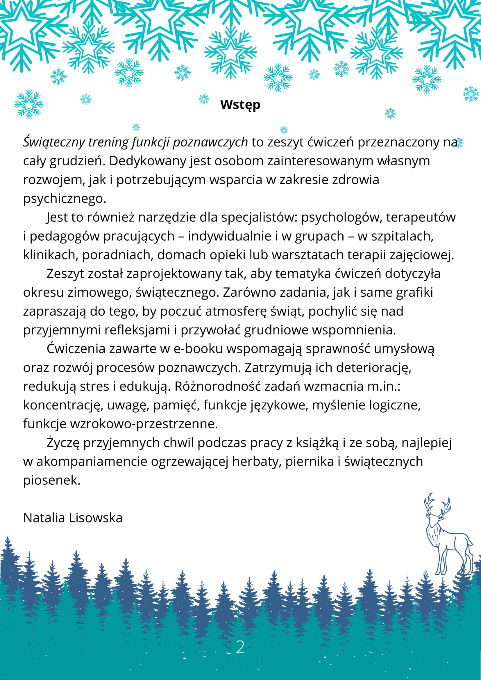 Zeszyt został zaprojektowany tak, aby tematyka ćwiczeń dotyczyła okresu zimowego, świątecznego. Zarówno zadania, jak i same grafiki zapraszają do tego, by poczuć atmosferę świąt, pochylić się nad przyjemnymi refleksjami i przywołać grudniowe wspomnienia.