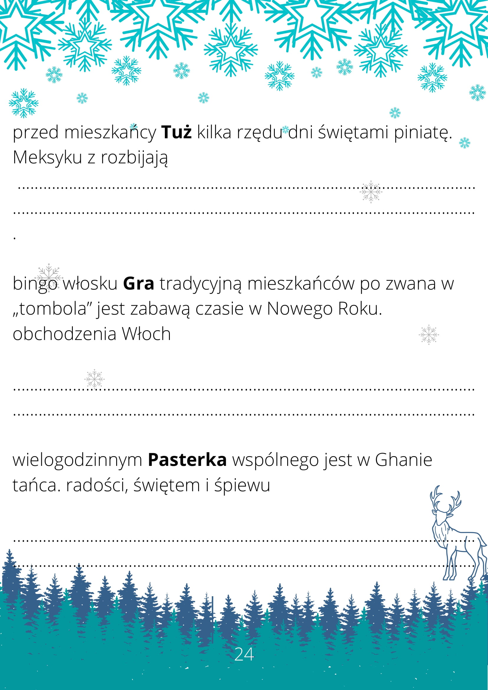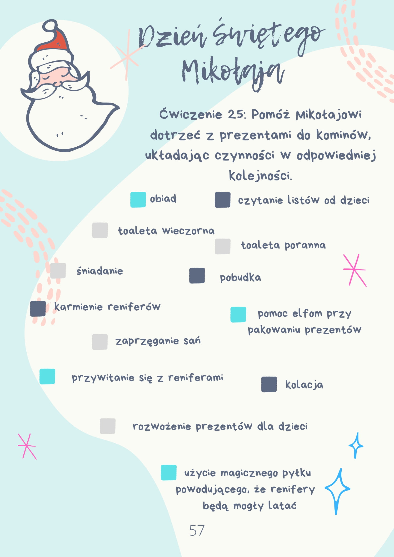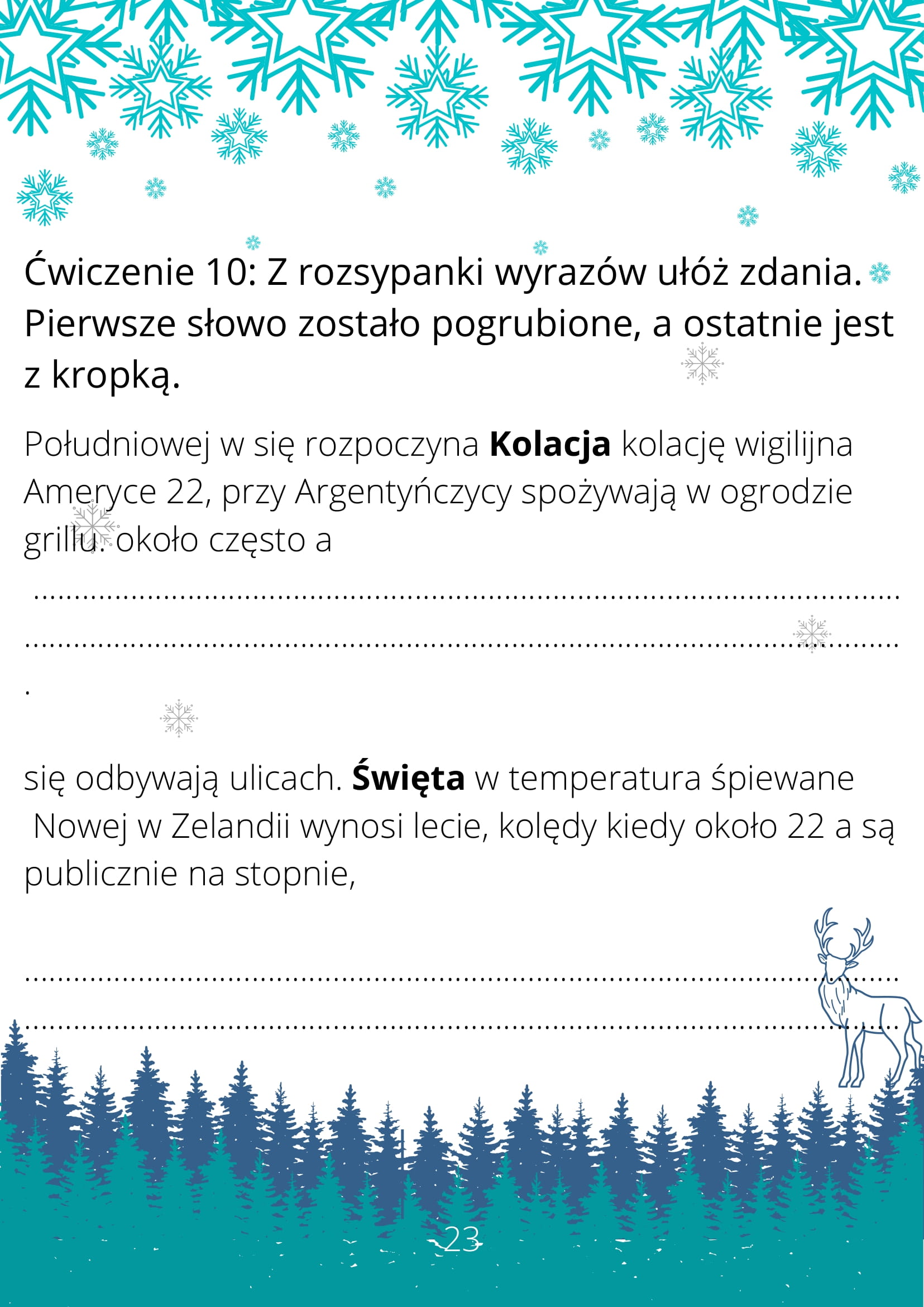 Zeszyt został zaprojektowany tak, aby tematyka ćwiczeń dotyczyła okresu zimowego, świątecznego. Zarówno zadania, jak i same grafiki zapraszają do tego, by poczuć atmosferę świąt, pochylić się nad przyjemnymi refleksjami i przywołać grudniowe wspomnienia.
